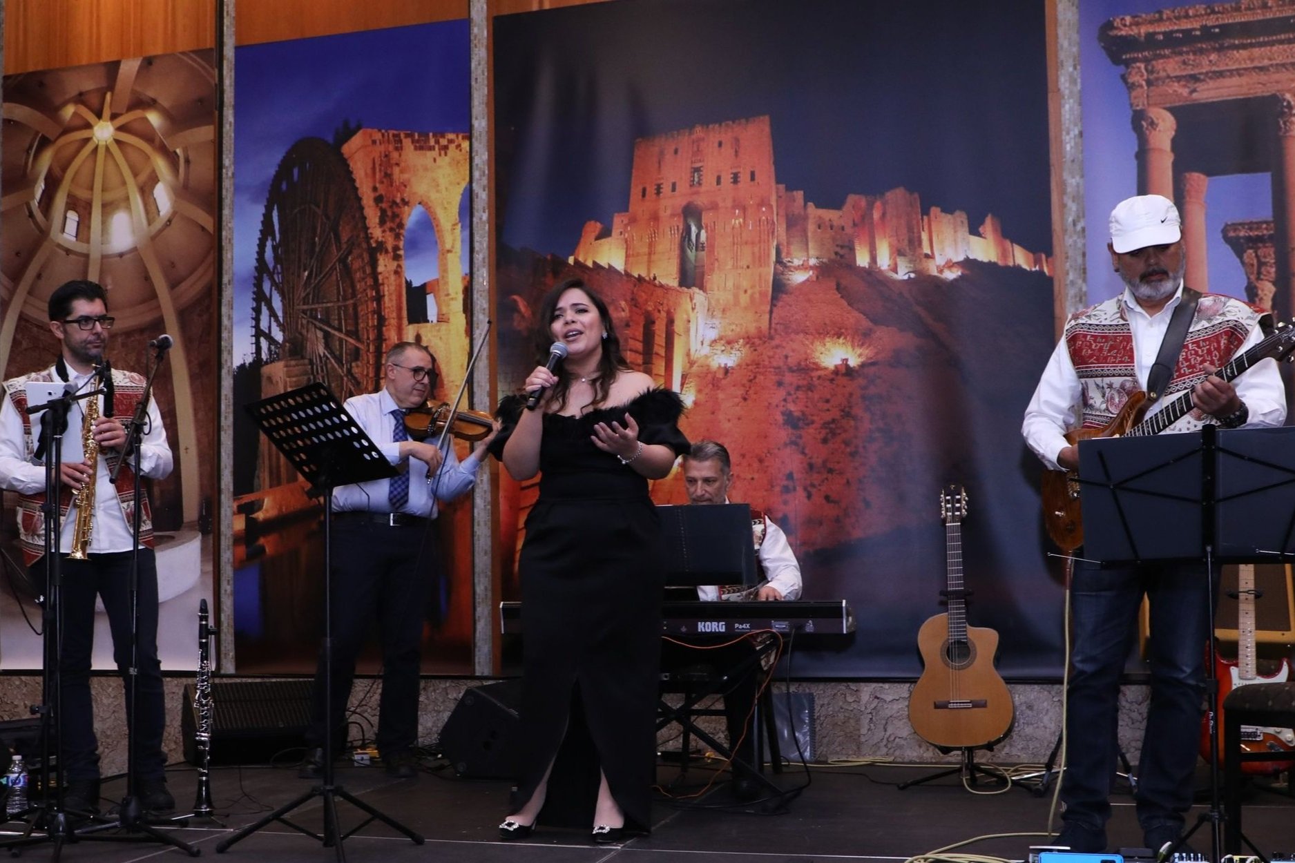 Հայ կեդրոնի մուտքին տեղադրուած Սուրիոյ քարտէսն ու «Հիւրընկալ Սուրիան, հայաշունչ Հալէպը» պաստառը ներկաները առաջնորդեց դէպի սրահ, ուր ցուցադրուած էին աշխարհահռչակ գեղանկարիչ Գէորգ Մուրատի արուեստի գործերէն նմոյշներ։ Սուրիոյ տեսարժան վայրերու պաստառներով զարդարուած էր բեմը, իսկ սրահին վերջնամասը տեղադրուած էր սուրիահայ մշակոյթին վերաբերող իւրայատուկ ցուցահանդէսի բաժինը, որ կ’ընդգրկէր սուրիական արտադրութիւններ, թանկարժէք զարդեր, հայկական ձեռագործ-ասեղնագործներ, արաբական հիւրասենեակ մը, Հալէպի «Ներսի շուկան» մարմնաւորող հսկայ պատկերներ, ինչպէս նաեւ վաճառքի սեղաններ։