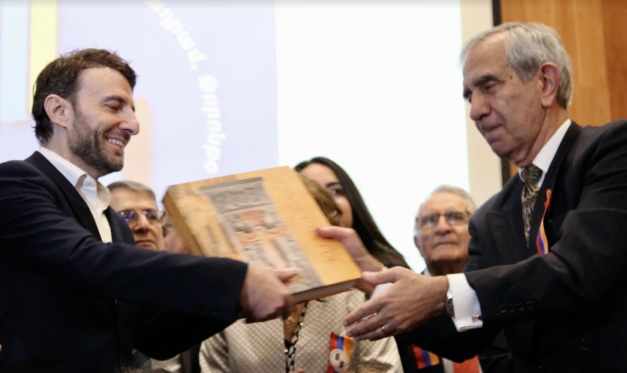 Ատենապետը Սերուժ Գրաճեանին Հրայր Խաչերեանի գիրքը կը նուիրէ (լուսանկար՝ Յարութիւն Դերձակեանի)