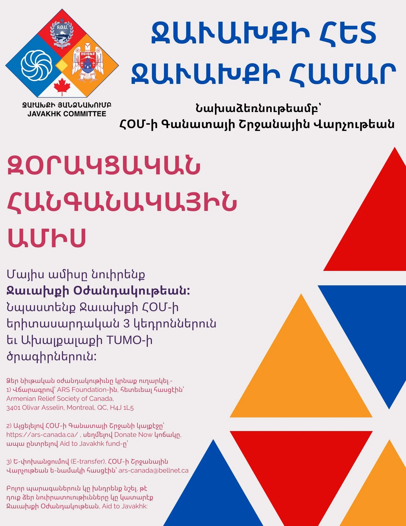 Ձեր նիւթական օժանդակութիւնը կրնաք ուղարկել վճարագիրով՝ ARS Foundation-ին, հետեւեալ հասցէին՝ Armenian Relief Society of Canada, 3401 Olivar Asselin, Montreal, QC, H4J 1L: Կարելի է նաեւ առցանց կատարել ձեր նուիրատուութիւնը, այցելելով ՀՕՄ-ի Գանատայի շրջանի կայքէջը՝ ars-canada.ca ու սեղմելով Donate Now կոճակը ու ընտրելով Aid to Javakhk fund-ը, կամ ե-փոխանցումով (e-transfer), ՀՕՄ-ի Գանատայի շրջանային վարչութեան ե-նամակի հասցէին՝ ars-canada@bellnet.ca-ին: